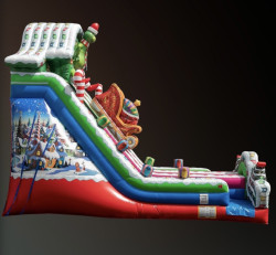Arriving Nov. 30, 2025! The new Christmas themed slide is 24' tall with double lanes for racing and measures 33' long and 12' wide. This slide is a must have for your holiday event!!!